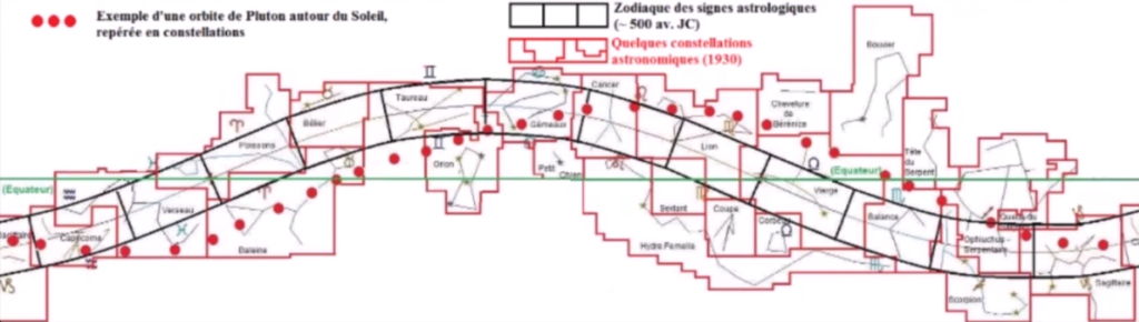 On peut aussi faire remarquer que les orbites des planètes ne sont pas exactement toutes (tout le temps) sur la bande zodiacale. Regardons cette image, tirée d’une conférence de Serge Bret-Morel : « L’Astrologie et la Science, y a-t-il du vrai ?« :