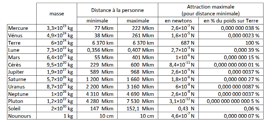 « C’est bien la Terre qui nous attire […]. En deuxième position, on trouve le Soleil, puis la Lune, Jupiter… mais leur attraction est excessivement faible. On peut remarquer que l’attraction de Cérès est plus importante que celle de Pluton. Celle du nounours est du même ordre de grandeur que celle de Mercure ou de Mars.« . Qu’en penser alors ?